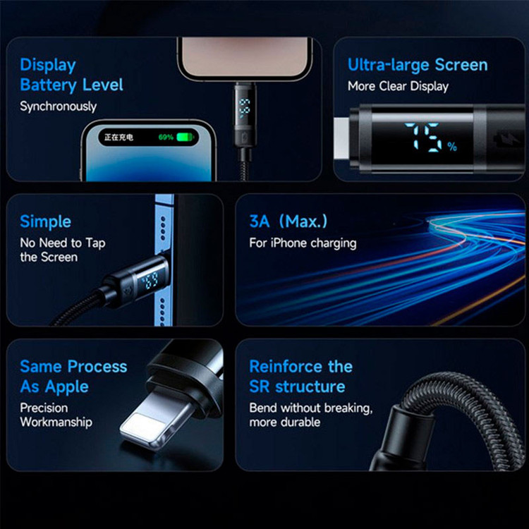 مجهز به نمایشگر LED بر روی کانکتور به منظور اطلاع از میزان درصد شارژ تنها برای گوشی آیفون