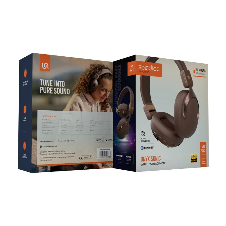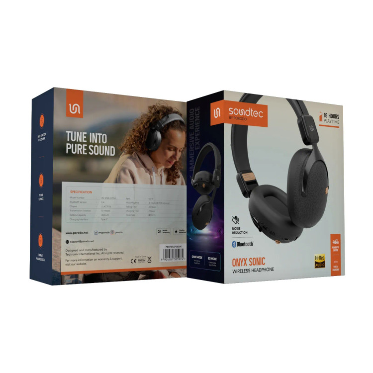 هدفون بیسیم Porodo Soundtec Onyx Sonic از بلوتوث ۵.۴ و تراشه JL AC7026 با عملکرد بالا برای صدای فوقالعاده استفاده میکند. باتری ۳۵۰ میلیآمپر ساعتی میتواند هدفون را برای ۱۸ ساعت پخش موسیقی با حجم صدای ۷۰ درصد یا ۲۰ ساعت مکالمه با یک بار شارژ، شارژ کند. شارژ سریع از طریق Type-C تنها ۲ ساعت طول میکشد. این هدفون که به درایورهای ۴۰ میلیمتری مجهز است، صدای غنی و شفاف و قابلیت کاهش نویز را برای بهترین تجربه صوتی فراگیر ارائه میدهد. طراحی جمعوجور آن امکان استفاده و حمل در حال حرکت را فراهم میکند. پخش کارت TF برای موسیقی آفلاین و برخی حالتهای کنترل، از جمله کلید چند منظوره، حالت بازی و حالت EQ برای افزایش بیشتر خروجی صدا، در دسترس است. این هدفونها با برد انتقال ۱۰ متر، برای ارائه کمی آزادی برای لذت بردن از موسیقی، بازی یا تماس عالی خواهند بود. برای استفاده روزانه، بازیها و زمان موسیقی در حال حرکت.