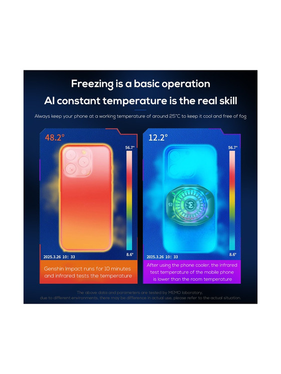 توان این خنک کننده حرفه ای، حدود 11 وات است. این خنک کننده پس از روشن شدن می تواند دمای موبایل را به صورت آنی پایین بیاورد. چیپست TEC به کار رفته در ساخت این فن رادیاتور قدرتمند، باعث خنک کنندگی آنی و پایدار آن می شود. رسانایی بالا در کنار سطح تماس بزرگ، باعث می شود تا خنک کننده ممو CX10 RGB Pro بتواند دمای موبایل شما را به سرعت پایین بیاورد.
