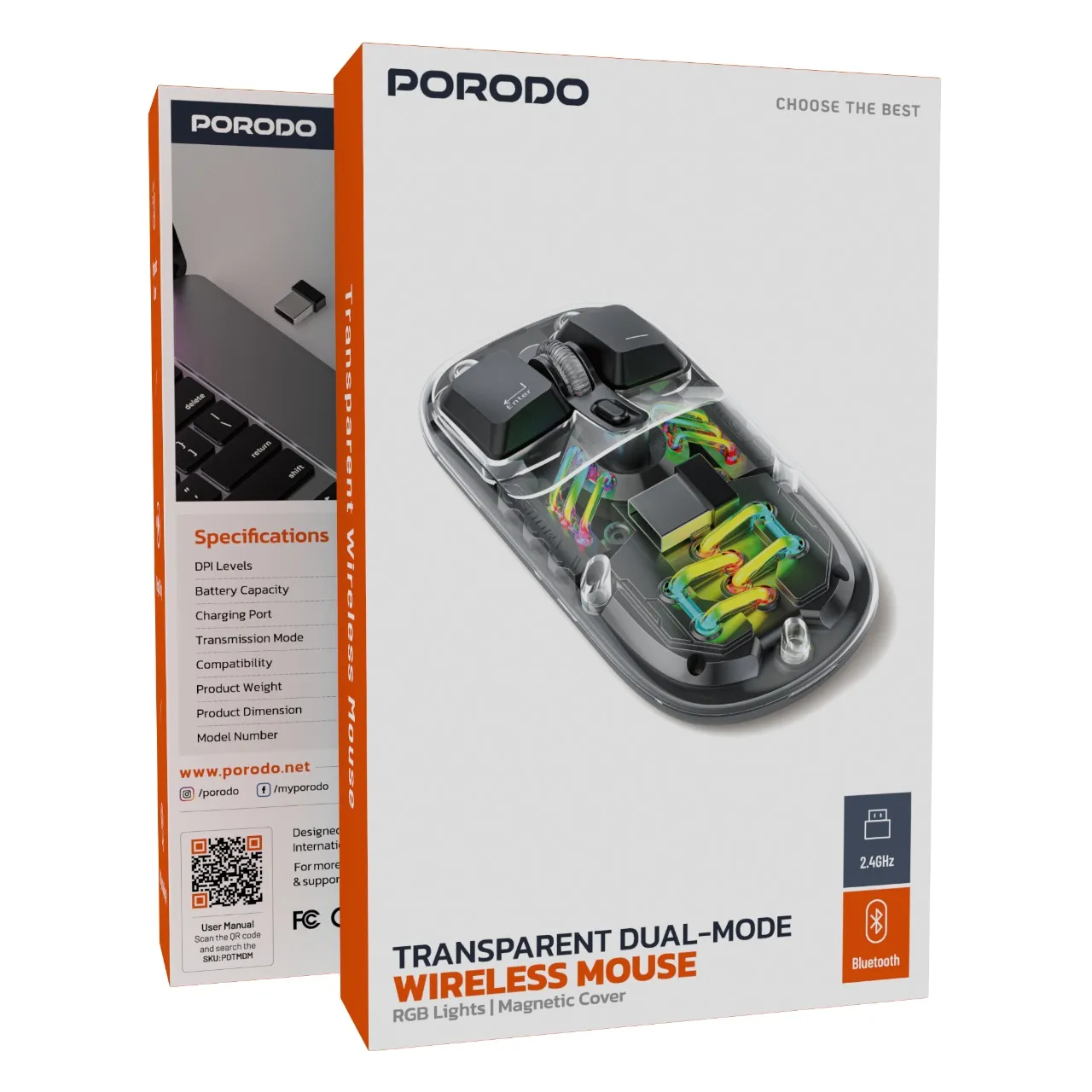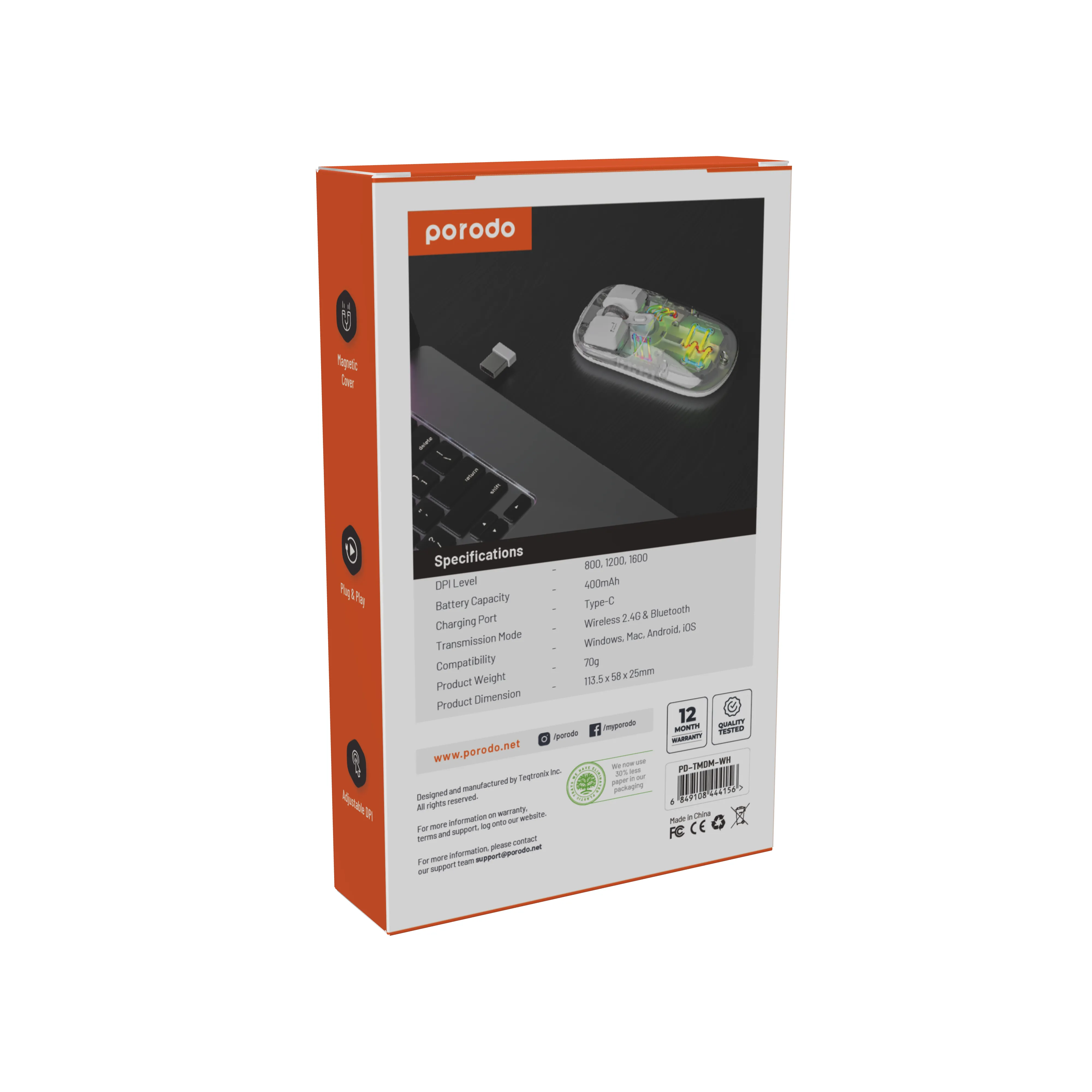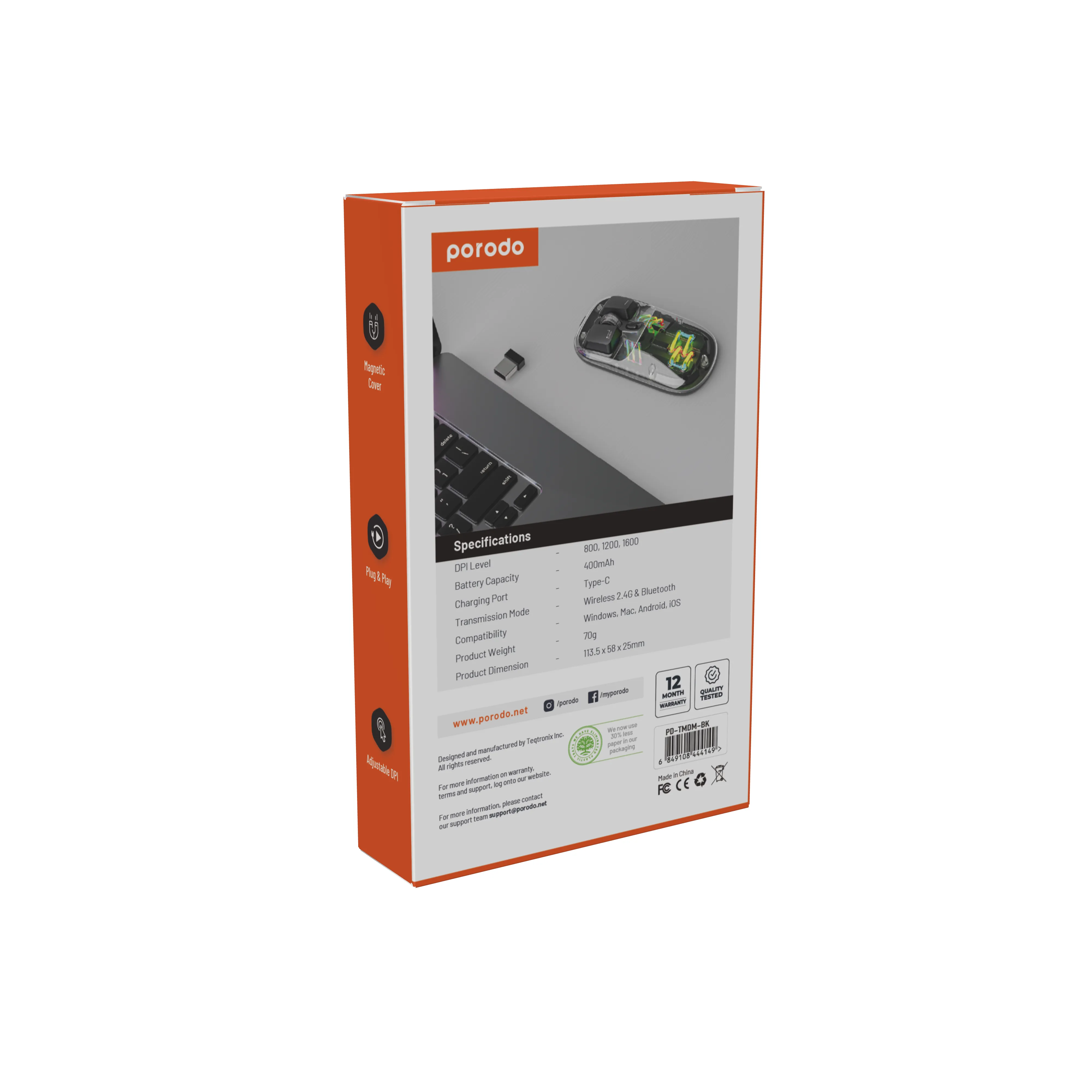 پورودو ماوس بیسیم دو حالته شفاف را معرفی میکند، دستگاهی عالی برای به حداکثر رساندن زیبایی و راحتی لپتاپ یا کامپیوتر شما. این ماوس دارای ظرفیت باتری ۴۰۰ میلیآمپر ساعت، نور RGB و DPI قابل تنظیم (۸۰۰، ۱۲۰۰، ۱۶۰۰) است. میتوانید به سادگی از طریق بلوتوث یا حالت بیسیم متصل شوید و آن را از طریق پورت Type-C شارژ کنید. علاوه بر این، با ویندوز، مک، اندروید و iOS سازگار است.