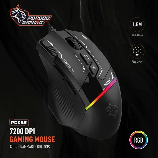 این ماوس سیمی Porodo Gaming 8D RGB است. این ماوس به حساسیت 7200 DPI برای بهترین کنترل و دقت در بازیهای شما مجهز شده است. این ماوس دارای 8 دکمه قابل برنامهریزی است که به شما امکان میدهد کنترل ماوس خود را سفارشی کنید. علاوه بر این، نورپردازی RGB طیف رنگی را اضافه میکند تا بهترین تجربه ممکن را فراهم کند. از دیگر ویژگیهای ماوس که طول عمر آن را افزایش میدهد میتوان به کابل بافته شده 1.5 متری مقاوم در برابر گره خوردن و سوئیچی که تا 3 میلیون کلیک را پشتیبانی میکند، اشاره کرد. این یک دستگاه بازی عالی برای همه گیمرها است.