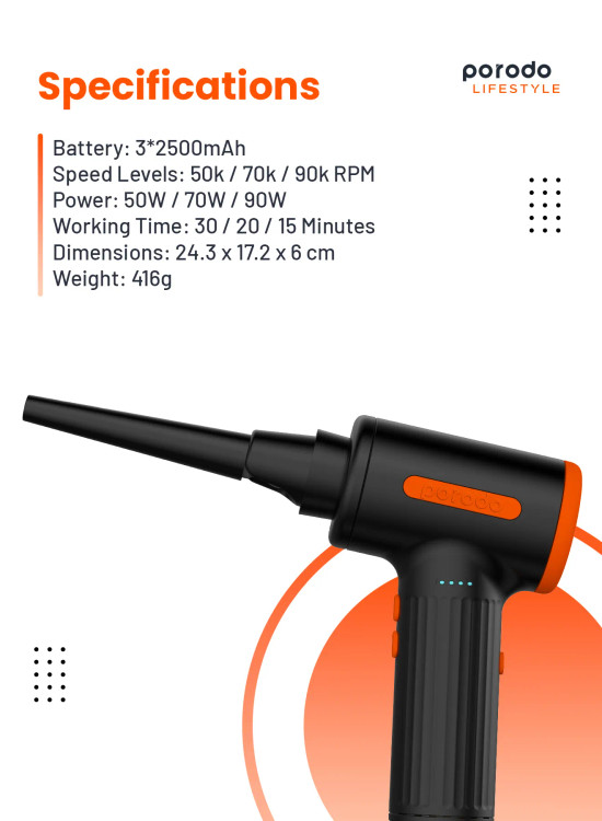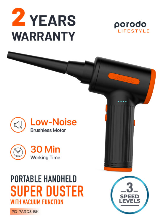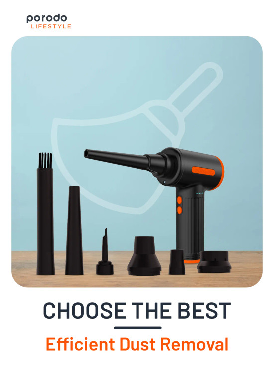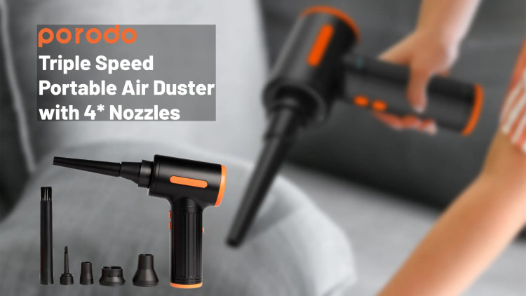 گردگیر بادی قابل حمل سه سرعته Porodo ابزاری ضروری برای تمیز کردن موثر صفحه کلید، کامپیوتر و سایر لوازم الکترونیکی ظریف است. با طراحی باشکوه و قدرت چشمگیر خود، به طور گسترده به عنوان انتخابی قابل اعتماد و کارآمد برای اکثر کاربران در نظر گرفته میشود. این دستگاه نه تنها به صورت قابل حمل و دستی طراحی شده است، بلکه دارای یک چراغ LED داخلی نیز میباشد که استفاده از آن را در مناطق تاریک یا کم نور راحت میکند. چیزی که این گردگیر بادی را متمایز میکند، تطبیق پذیری آن است که به لطف شش نازل مختلف ارائه میشود. نازل دمنده برای از بین بردن گرد و غبار از دستگاههای الکترونیکی ایدهآل است، در حالی که نازل دمنده برسدار برای تمیز کردن فضای داخلی خودرو و از بین بردن گرد و غبار از واحدهای تهویه مطبوع عالی است.علاوه بر این، نازل بادکننده حلقه شنا میتواند برای باد کردن حلقههای شنا و توپهای یوگا استفاده شود، در حالی که نازل بادکننده تخت بادی به طور خاص برای باد کردن تختهای بادی طراحی شده است. علاوه بر این، نازل کیسه خلاء امکان استفاده از کیسه نگهداری خلاء را فراهم میکند و نازل خروجی تخت بادی به خالی کردن تختهای بادی کمک میکند. برای رفع نیازهای مختلف نظافتی، دستگاه گردگیر هوا سه سطح سرعت ارائه میدهد که به شما امکان میدهد تنظیمات مناسب را برای هر کار انتخاب کنید. علاوه بر این، دارای یک موتور قدرتمند و بدون جاروبک است که آن را برای استفاده در محیطهایی که سر و صدا نگران کننده است، مانند خانهها و دفاتر، مناسب میکند. دستگاه گردگیر هوا از شارژ راحت پشتیبانی میکند و به یک باتری داخلی 7500 میلیآمپر ساعتی مجهز است که با یک بار شارژ تا 30 دقیقه کار مداوم را فراهم میکند.