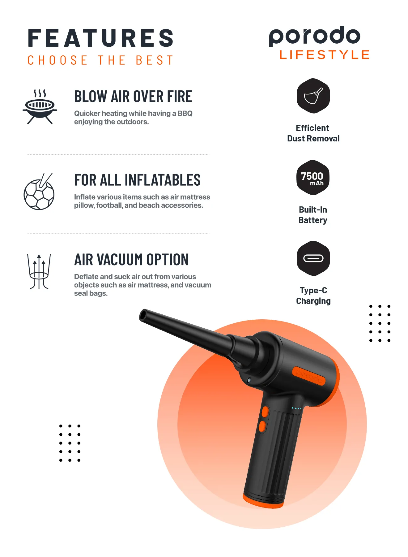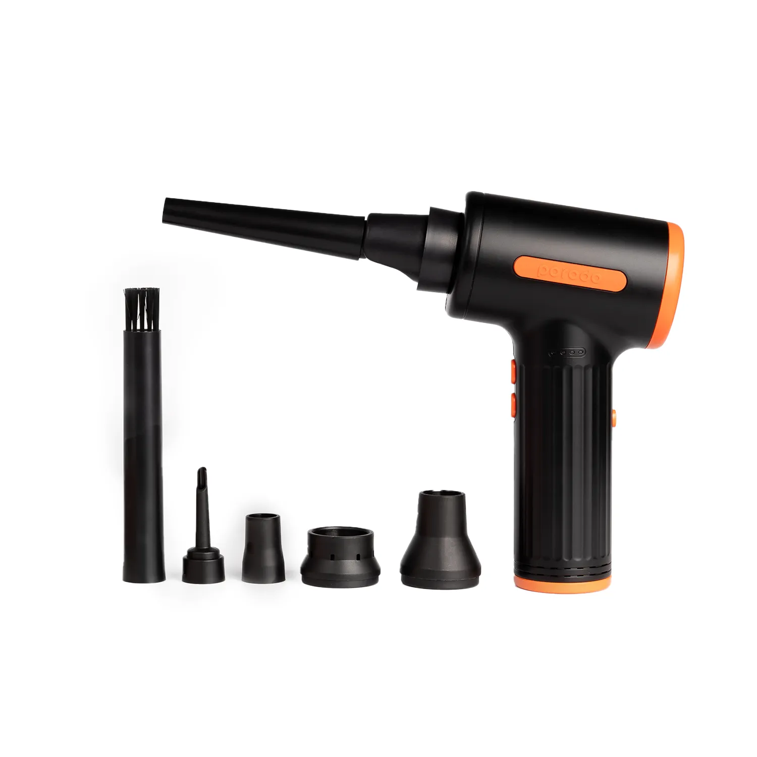 گردگیر بادی قابل حمل سه سرعته Porodo ابزاری ضروری برای تمیز کردن موثر صفحه کلید، کامپیوتر و سایر لوازم الکترونیکی ظریف است. با طراحی باشکوه و قدرت چشمگیر خود، به طور گسترده به عنوان انتخابی قابل اعتماد و کارآمد برای اکثر کاربران در نظر گرفته میشود. این دستگاه نه تنها به صورت قابل حمل و دستی طراحی شده است، بلکه دارای یک چراغ LED داخلی نیز میباشد که استفاده از آن را در مناطق تاریک یا کم نور راحت میکند. چیزی که این گردگیر بادی را متمایز میکند، تطبیق پذیری آن است که به لطف شش نازل مختلف ارائه میشود. نازل دمنده برای از بین بردن گرد و غبار از دستگاههای الکترونیکی ایدهآل است، در حالی که نازل دمنده برسدار برای تمیز کردن فضای داخلی خودرو و از بین بردن گرد و غبار از واحدهای تهویه مطبوع عالی است.علاوه بر این، نازل بادکننده حلقه شنا میتواند برای باد کردن حلقههای شنا و توپهای یوگا استفاده شود، در حالی که نازل بادکننده تخت بادی به طور خاص برای باد کردن تختهای بادی طراحی شده است. علاوه بر این، نازل کیسه خلاء امکان استفاده از کیسه نگهداری خلاء را فراهم میکند و نازل خروجی تخت بادی به خالی کردن تختهای بادی کمک میکند. برای رفع نیازهای مختلف نظافتی، دستگاه گردگیر هوا سه سطح سرعت ارائه میدهد که به شما امکان میدهد تنظیمات مناسب را برای هر کار انتخاب کنید. علاوه بر این، دارای یک موتور قدرتمند و بدون جاروبک است که آن را برای استفاده در محیطهایی که سر و صدا نگران کننده است، مانند خانهها و دفاتر، مناسب میکند. دستگاه گردگیر هوا از شارژ راحت پشتیبانی میکند و به یک باتری داخلی 7500 میلیآمپر ساعتی مجهز است که با یک بار شارژ تا 30 دقیقه کار مداوم را فراهم میکند.