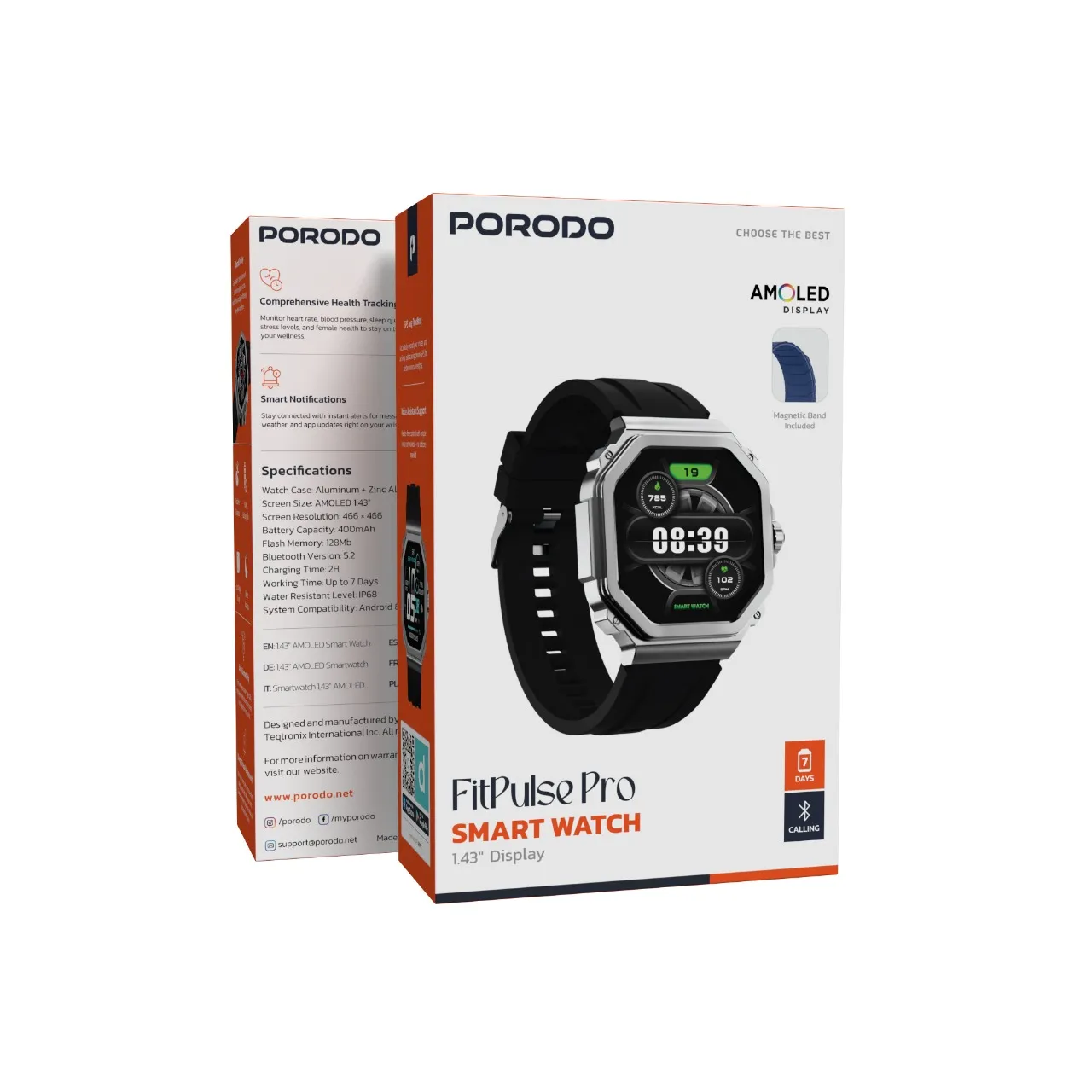 ساعت هوشمند Porodo FitPulse Pro یک صفحه نمایش 1.43 اینچی AMOLED با وضوح 466 × 466 پیکسل را در اختیار کاربران قرار میدهد که تصاویر واضح و زندهای را تولید میکند. قاب این ساعت ترکیبی از مواد آلیاژ آلومینیوم و روی است که هم زیبایی و هم دوام را به ارمغان میآورد. کاربران از طریق بلوتوث 5.2 میتوانند دریافت روان اعلانها و قابلیت تماس بلوتوث را تجربه کنند. این ساعت شاخصهای سلامت را از طریق ضربان قلب و نظارت بر خواب ردیابی میکند و در عین حال به کاربران امکان میدهد طرحهای صفحه ساعت خود را ایجاد کنند. باتری 400 میلیآمپر ساعتی آن هفت روز کار مداوم را فراهم میکند و مقاومت در برابر آب IP68 از ساعت در فعالیتهای روزمره محافظت میکند. این ساعت دارای یک بند مغناطیسی است که مراحل پوشیدن و درآوردن آن را ساده میکند. این ساعت هوشمند برای عملکرد به عنوان همراه سلامت و اتصال روزانه شما به پلتفرمهای اندروید 8.0+ و iOS 10.0+ نیاز دارد.