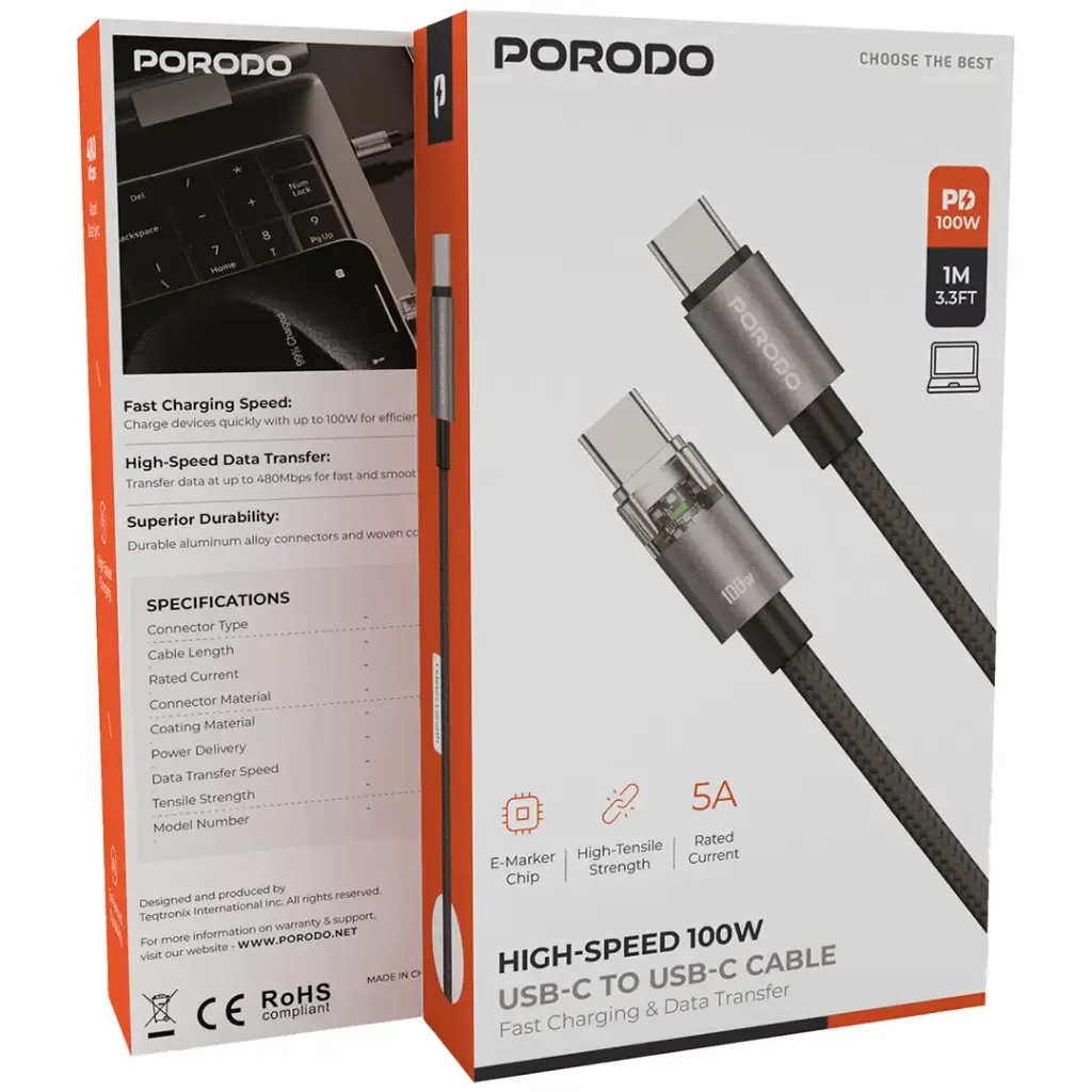کابل فست شارژ تایپ سی به تایپ سی Porodo PDEMC110W 100W