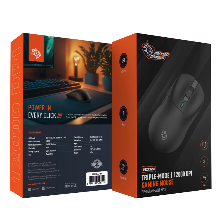ماوس بازی Porodo Gaming Triple-Mode 12000 DPI برای سرعت، دقت و راحتی ایدهآل است. این محصول از اتصالات سیمی USB-C، بیسیم 2.4 گیگاهرتز و بلوتوث در دستگاههای مختلف استفاده میکند. کاربران برای انجام بازیهای مختلف و داشتن حساسیت روان، شش سطح DPI قابل تنظیم از 800 تا 12000 در دسترس دارند. حسگر Pixart 3311 ردیابی روان را ارائه میدهد، در حالی که سوئیچهای TTC دوام 20 میلیون کلیک را ارائه میدهند. هفت کلید قابل تنظیم روی برد، شخصیسازی مؤثر و افزایش بهرهوری را به واقعیت تبدیل میکنند. ساختار سبک، قابلیت استفاده طولانی مدت را تضمین میکند، در حالی که نرخ نمونهبرداری بالا تا 1000 هرتز، پاسخ آنی را تضمین میکند، که به معنی پاسخ سریع، دقیق و بدون تأخیر است، از این رو یک مزیت عملکرد بازی محسوب میشود.