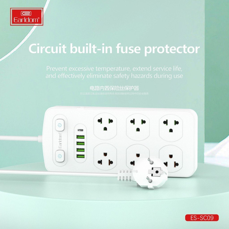 مجهز به 4 پورت USB به منظور شارژ دستگاه های سازگار و 1 پورت Type-C، دارای 6 عدد پریز ارت دار، دوشاخه از نوع EU مناسب برای پریز های برق ایران