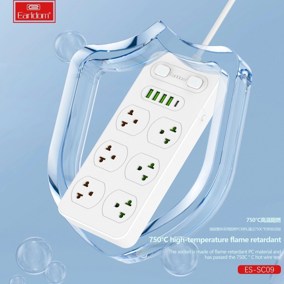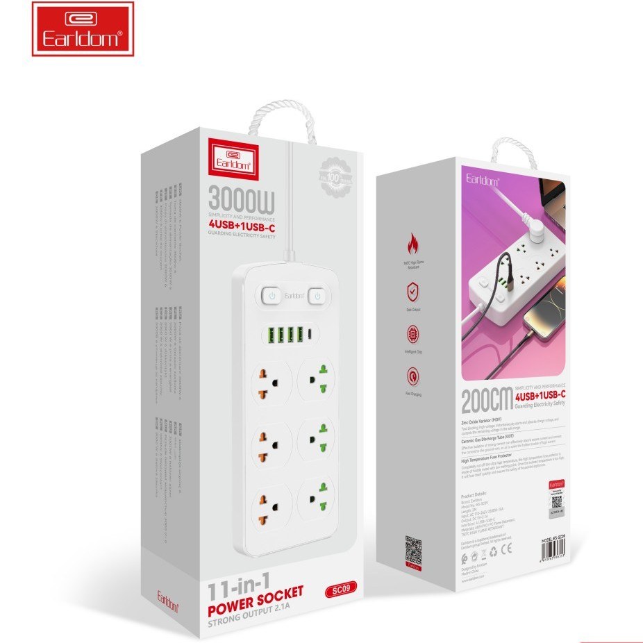 مجهز به 4 پورت USB به منظور شارژ دستگاه های سازگار و 1 پورت Type-C، دارای 6 عدد پریز ارت دار، دوشاخه از نوع EU مناسب برای پریز های برق ایران