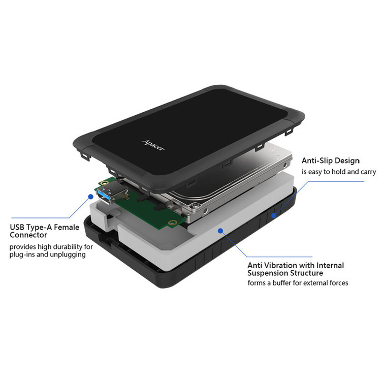 مجهز به رابط اتصال USB 3.2 نسل اول با پشتیبانی از USB 2.0 و کسب استانداردهای جهانی CE ،FCC ،BSMI و RCM اتصال با سیم به انواع لپ تاپ، کامپیوتر و دستگاه های دارای سیستم عامل ویندوز، مک و لینوکس دارای بدنه جمع و جور از جنس پلاستیک با طراحی ضد لغزش برای جلوگیری از سر خوردن و افتادن بهره مندی از فضای ذخیره سازی ۲ ترابایتی مناسب برای نگهداری انواع فایل باکیفیت مانند عکس اچ دی، فیلم ۴K، موزیک و ... قابلیت تهیه بک آپ از اطلاعات ذخیره شده و مدیریت بیشتر حافظه با نصب نرم افزار Apacer Data Manager