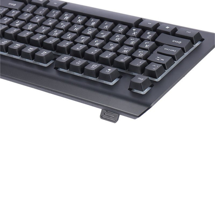 کیبورد دارای 104 عدد کلید شامل کلید های مولتی مدیا، FN و ... با برخورداری از حروف فارسی حک شده بر روی کلیدها