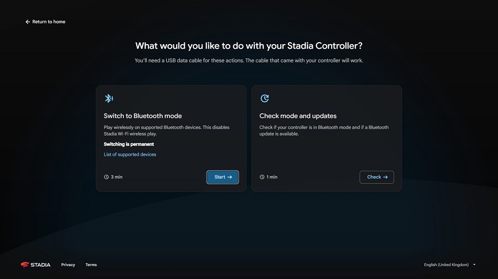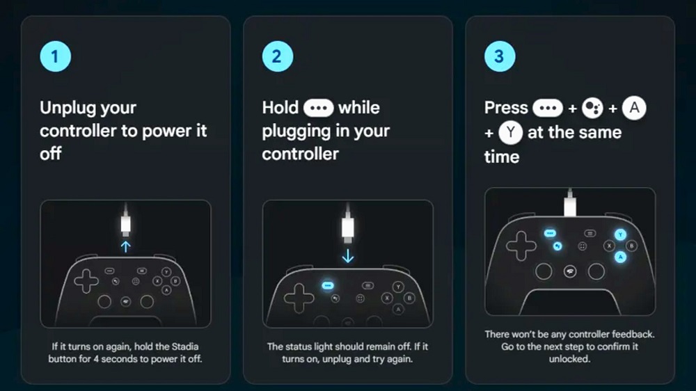 در صورت موفقیت آمیز بودن این روند، اکنون باید بتوانید بهروزرسانیهای مورد نیاز برای حالت بلوتوث را دانلود کنید. گوگل نکاتی را ارائه میکند که به شما در برطرف کردن هر گونه اشتباه در طول فرآیند اتصال، کمک میکند؛ کمکهایی مانند نگه داشتن دکمه Stadia برای اطمینان از خاموش شدن دسته پس از انجام مرحله اول. بنابراین بازدید مجدد از هر مرحله، مشکلات احتمالی را برطرف میکند. پس از آماده شدن، میتوانید با انجام کارهای زیر پچ ذکر شده را برای دسته دانلود کنید: